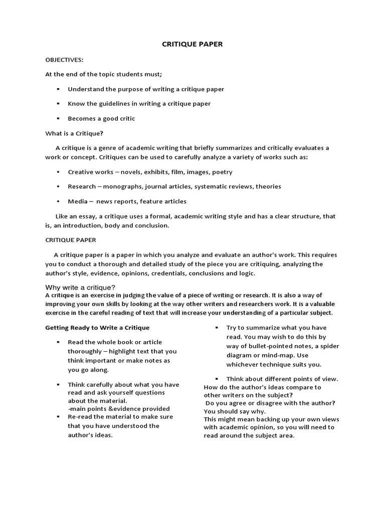 Critique Paper Example Poem : Literatures In English Cape Critique Ofjose Ricardo Padilla Guevara - A critique is usually written in response to a creative work, such as a novel, a film, poetry, or a painting.